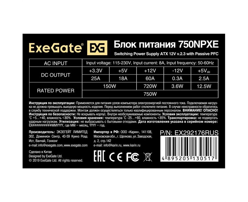 Блок питания ExeGate 750NPXE EX292176RUS 750W (ATX, PPFC, 12cm fan, 24pin, 2x(4+4)pin, PCIe, 4xSATA, 3xIDE, FDD, black)