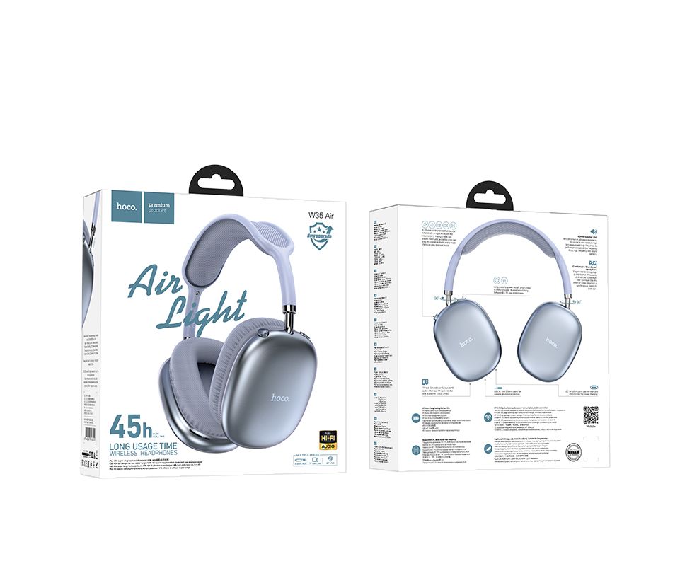 У наушников W35 Air эргономичный дизайн, их удобно носить, не защемляя уши. Выдвижная и Вращающаяся конструкция, хорошо соответствующая контуру уха, удобство ношения. Емкость аккумулятора: 400 мАч, время зарядки: 2 часа. Размер: 204*185*84 мм