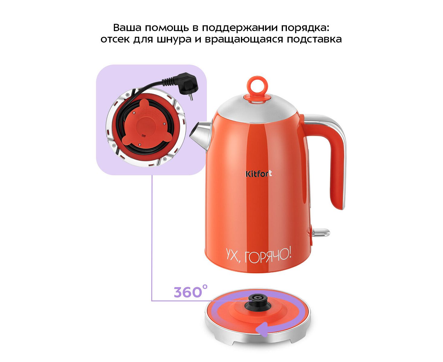 Подставка с центральным контактом позволяет удобно разместить чайник, поворачивая его на 360°. В нижней части подставки имеется специальный отсек для хранения шнура, предотвращая его спутывание и обеспечивая порядок на столе.