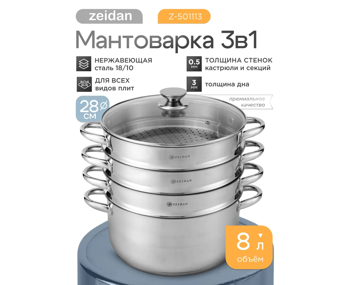 Мантоварка ZEIDAN Z-501113 d28см 8,0л нерж, 3-х слойное капсулированное индукционное дно