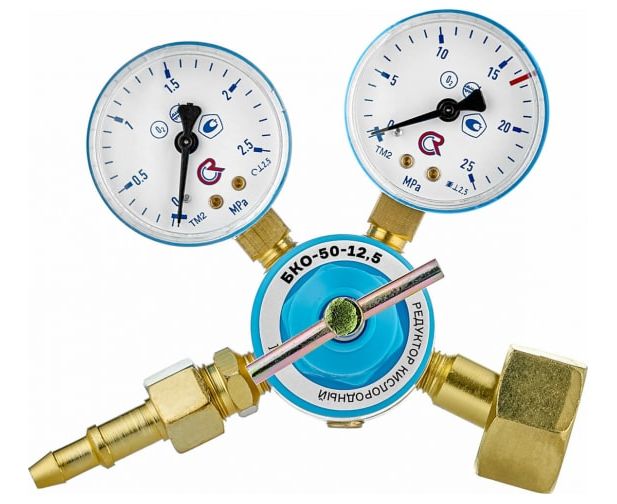 Редуктор кислородный БКО-50-12,5 ПТК 00000033557 предназначен для понижения давления газа. Автоматически поддерживает заданное рабочее давление.